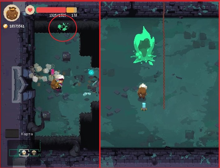 2. В одной из комнат найти яму с клубами зеленого дыма (скрин для наглядности) и прыгнуть туда.