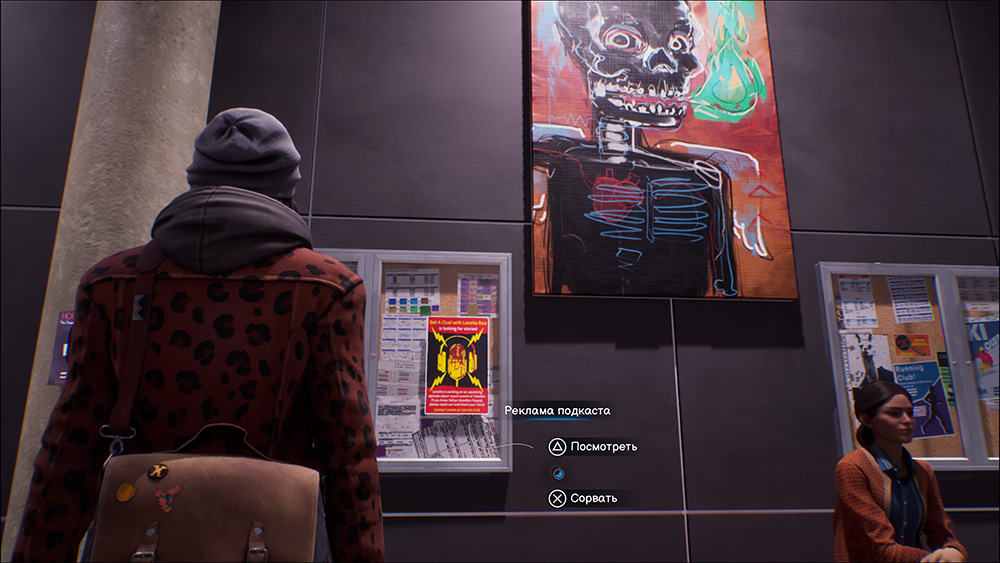 Теперь идем разговаривать к Ясмин, а после разговора возвращаемся в факультет искусств. После кат-сцены с Лореттой идем чуть левее от кабинета Гвен и видим постер, приклеенный на доску объявлений. Срываем его
