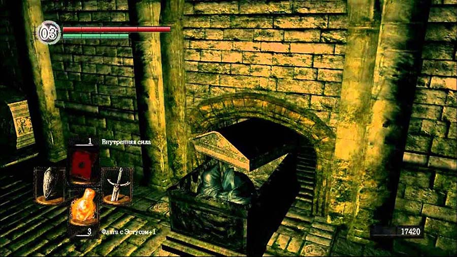 Итак, путь наш лежит в Катакомбы, блуждаем там, орем и как следует исследуем. Ориентиром для нас будет Огромный Титанитовый Демон. Рядом с ним будет открытый гроб, с которым можно взаимодействовать.