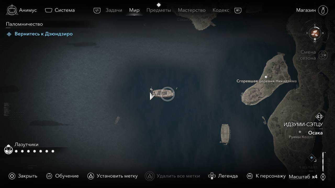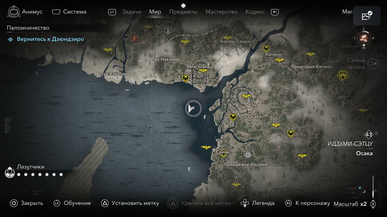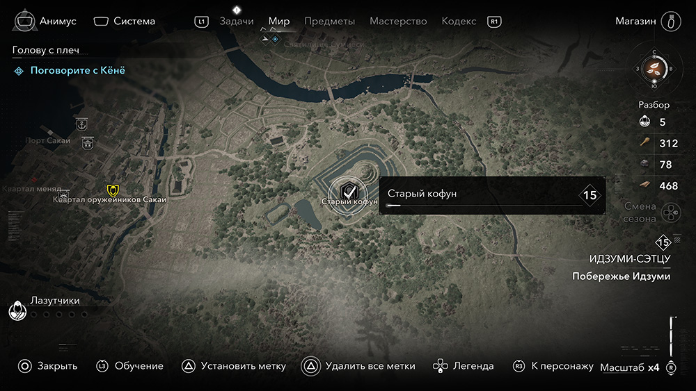 Около Сакаи есть "Старый кофун". Идем в него, проходим по кофуну и доходим до места, в котором нужно два раза схватиться крюком чтобы перебраться через воду. В первый раз раскачиваемся на крюке и не хватаемся за второй а просто прыгаем вперед. Совмещаем с трофеями "На крючке" и "Расхитители кофунов"