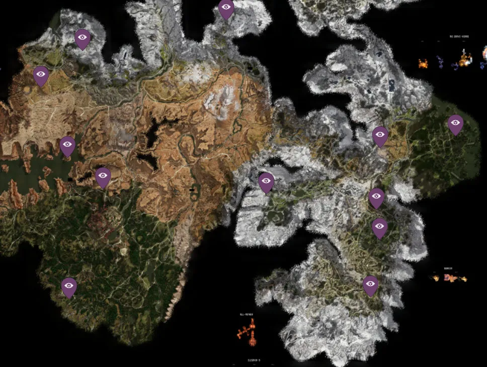 Всего в игре 12 обзорных точек. Практически у любого торговца можно купить карты с местоположением всех коллекционных предметов, в том числе и этого. Обзорная точка на карте обозначена символом «Глаза»(как на картинке трофея) и находится на возвышенностях. Всегда рядом с точкой находится сундук, можно ориентироваться по нему.
