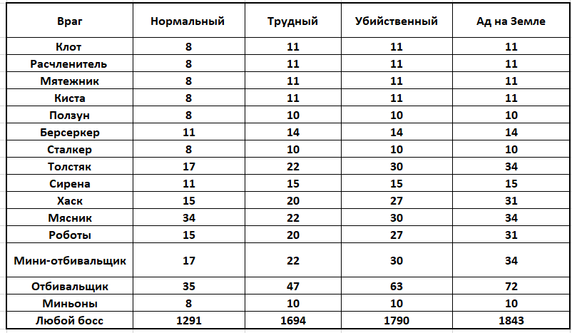 Опыт, получаемый на каждом уровне сложности за каждого из мутантов (в таблице "миньоны" появляются только на боссе "Мерзость" - зелёная взрывающаяся слизь):