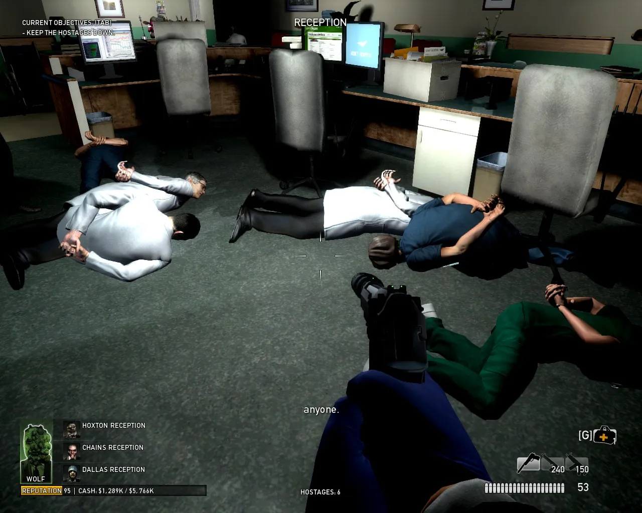 Если каждое условие выполнено, то вам необходимо взять заложника (на всех ограблениях они есть в начале в виде гражданских), либо вы можете взять служителя закона (опять же, не спец. юнита). Для этого вам необходимо дождаться конца штурма, ударить прикладом (или выстрелить из слабого оружия в ногу), а после несколько раз нажать на кнопку взаимодействия. В результате полицейский сложит оружие на землю, если такое произошло - жмите еще несколько раз, пока он не свяжет сам себе руки. Помните, что взять полицейского в заложники можно ТОЛЬКО между атаками полиции (штурмами), также стоит помнить, что чем больше хп у полицейского, тем тяжелее его заставить сдаться.