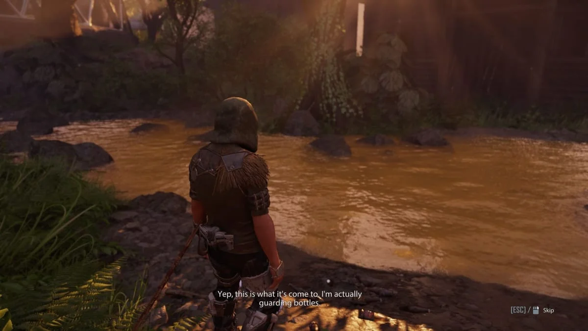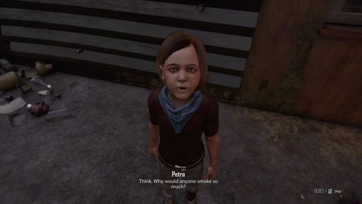 Продолжаем идти на север вдоль стены и наткнемся на последнего ребенка - Петру, которая хочет что-то показать. Следуем за ней за хижину и отвечаем на все ее вопросы, после чего она убежит поговорить с Хитчем. Обходим спереди и говорим с Хитчем, он расскажет что произошло.
