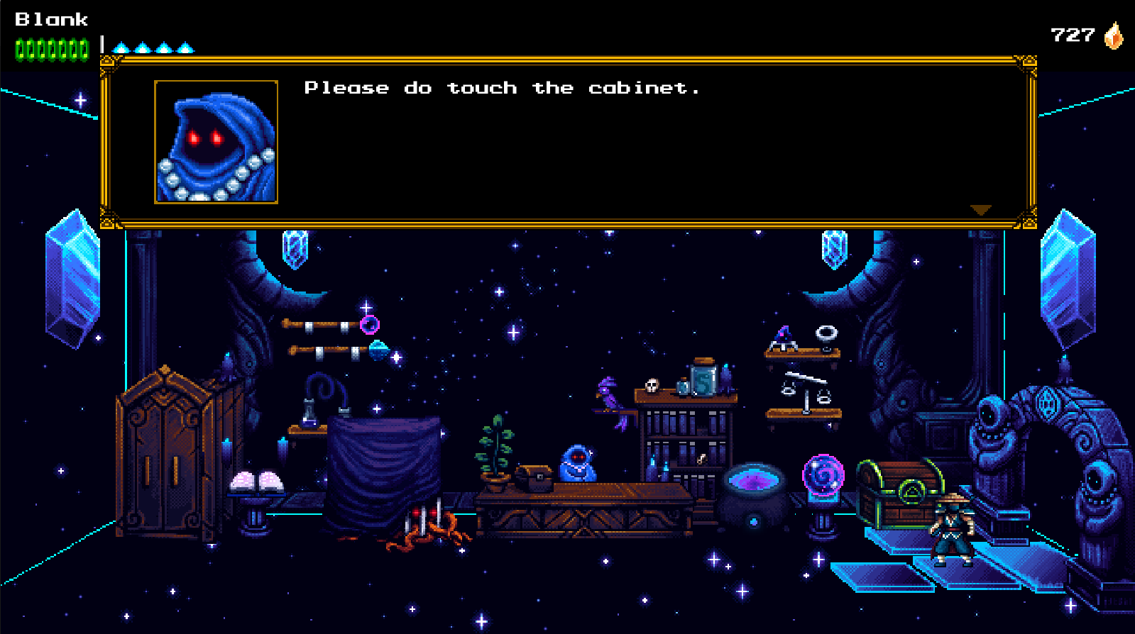 Как только вы достигнете вершины зоны Ледника, вы встретите последний магазин зоны. Внутри этого магазина нет продавца, но вы со шкафом можно взаимодействовать. Вам нужно будет взаимодействовать с ним в общей сложности 47 раз, прежде чем он начнет свою лекцию, которая намного длиннее первой.