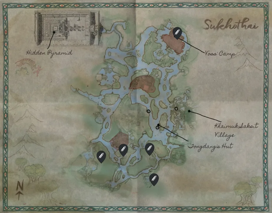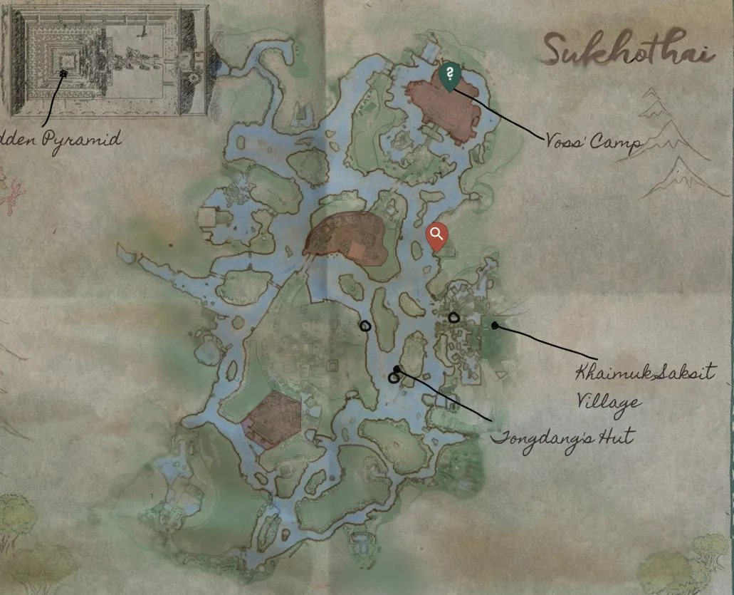 После того, как по сюжету мы посетим лавку Тхонгданга (где покупать маску подводного дыхания) и сядем назад в лодку, Джина нам выдаст этот квест. Едем к дому на дереве, где жил Аран, после чего едем на раскопки и спускаемся в гробницу, где находим Арана. Проходим головоломку с трубами(Перемещаем трубу, которая лежит у стены справа в трубопровод слева) и активируем подъемник, идем дальше и проходим еще одну головоломку с трубами(у стены поворачиваем рычаг, чтобы пустить воду и так же вставляем трубы в трубопровод). После того, как прошли головоломку, встречаемся с Араном и идем в тайную комнату, а после этого возвращаемся в деревню и говорим с Сунаном, получая трофей.