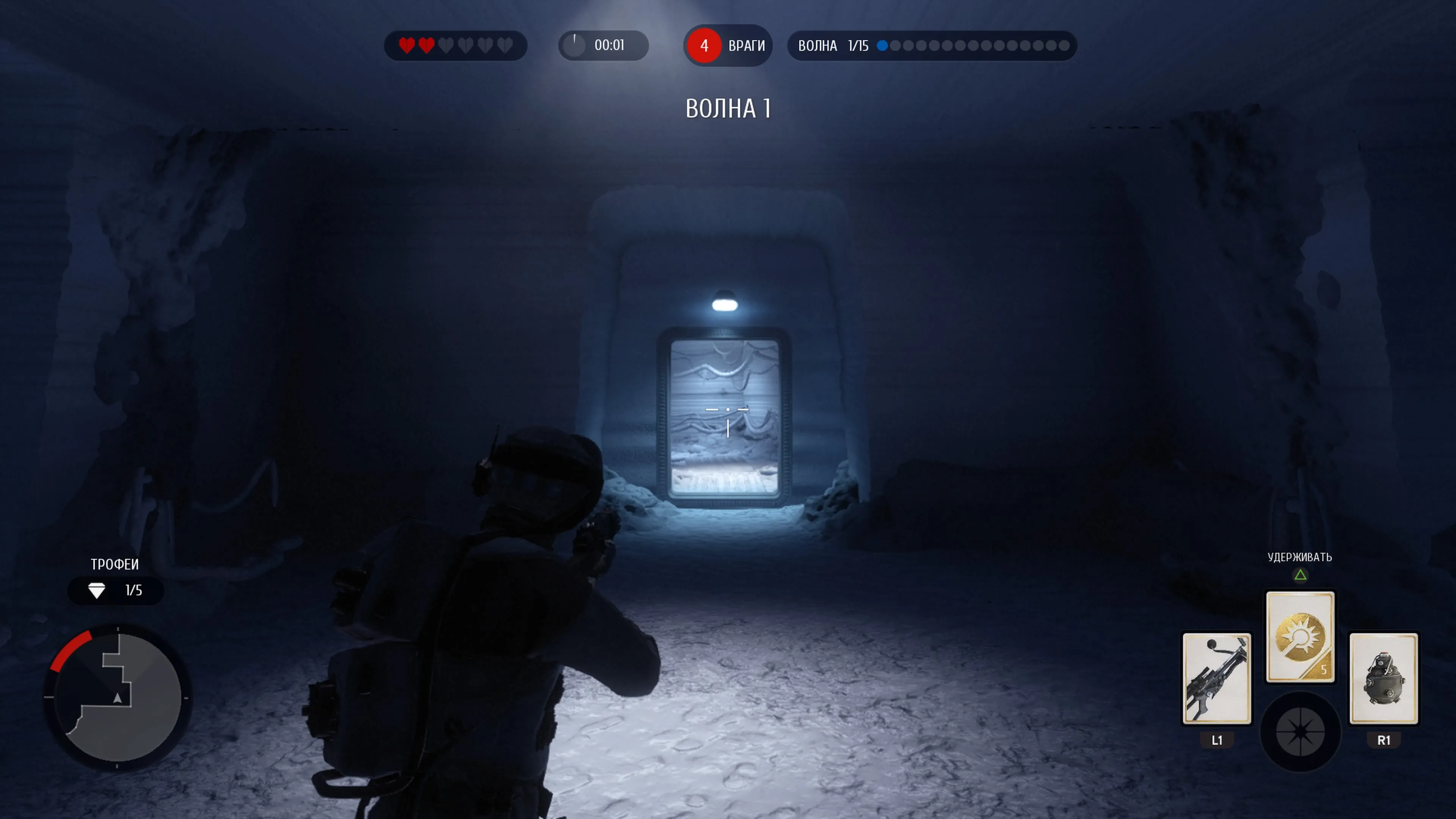 Легче всего это сделать на Хоте. Вам нужно получить бластерную пушку и разместить ее в месте, показанном на рисунке ниже. Оставайтесь в этом месте и разберитесь со всеми врагами. Некоторые враги, такие как дроиды-разведчики Viper, снайперы и десантники, не войдут, поэтому вам придется убивать их прямо через дверь. Кроме того, иногда враги просто застревают сзади и не идут, поэтому вам придется их осторожно выманивать. Как только они начнут приближаться, бегите обратно к турели. В целом это довольно легко, просто будьте осторожны, и вы обязательно получите трофей.