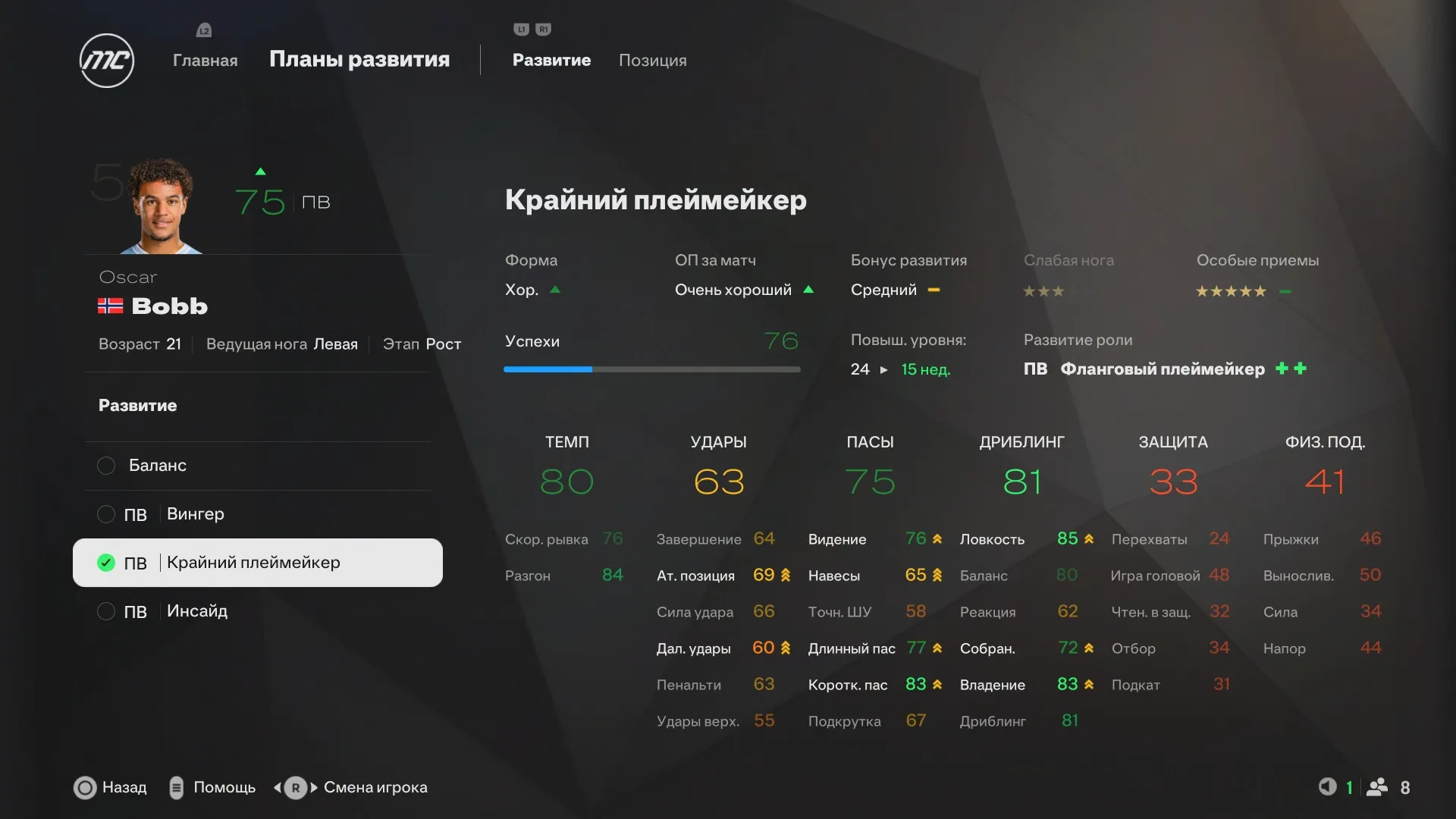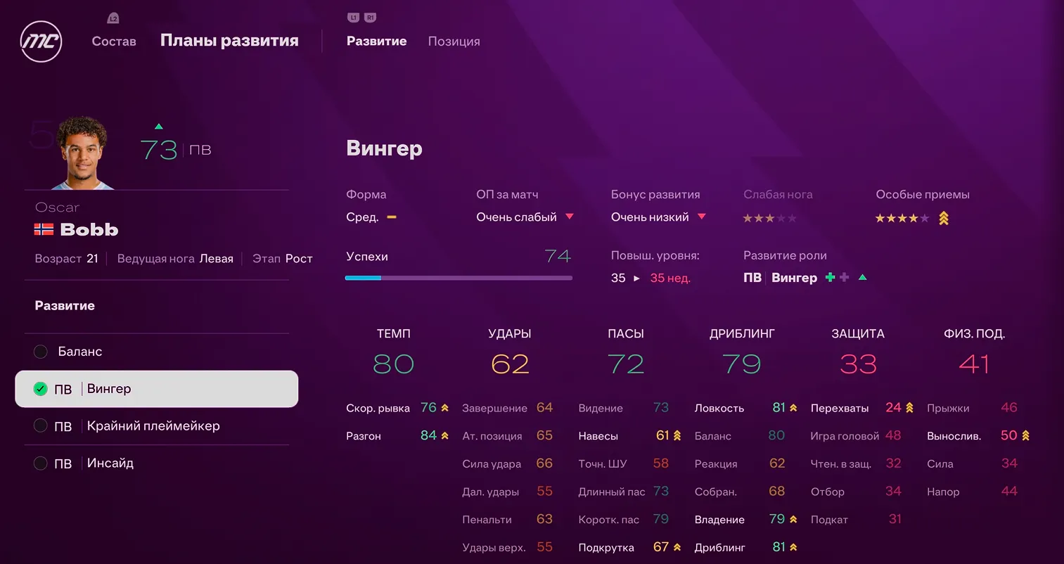Отмечу, что даже если в начале вы выбрали не Вингера, а Крайнего плеймейкера, то до конца сезона вы его точно прокачаете!